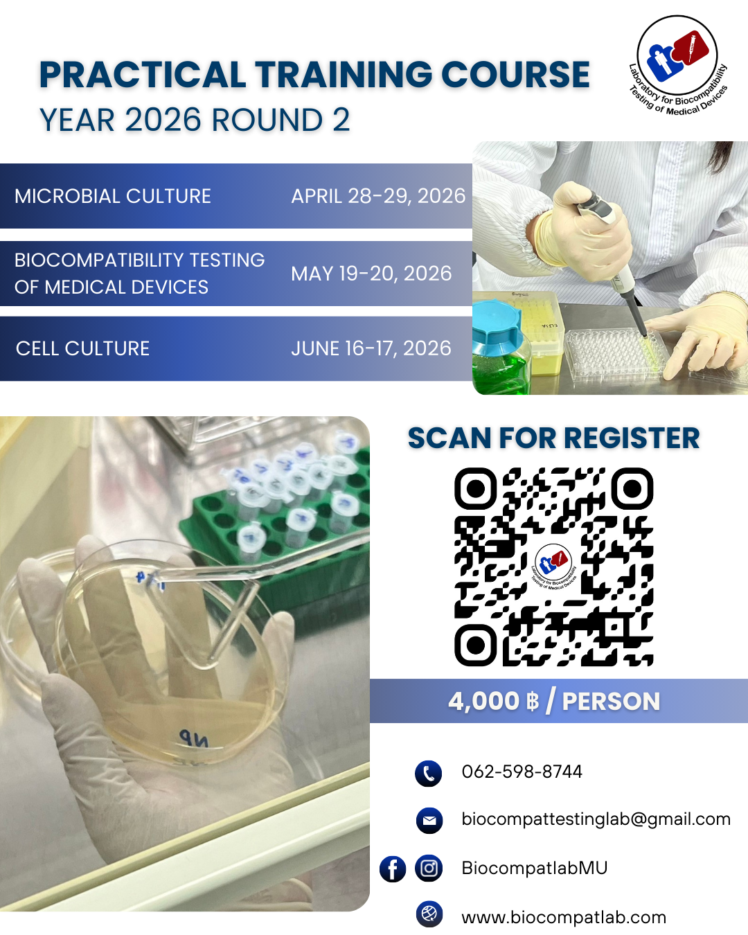 ห้องปฏิบัติการทดสอบความเข้ากันได้ทางชีวภาพของเครื่องมือทางการแพทย์ ISO 17025 จะจัดกิจกรรมอบรมเชิงปฎิบัติการในหัวข้อดังต่อไปนี้สำหรับปี 2569 รอบที่ 2